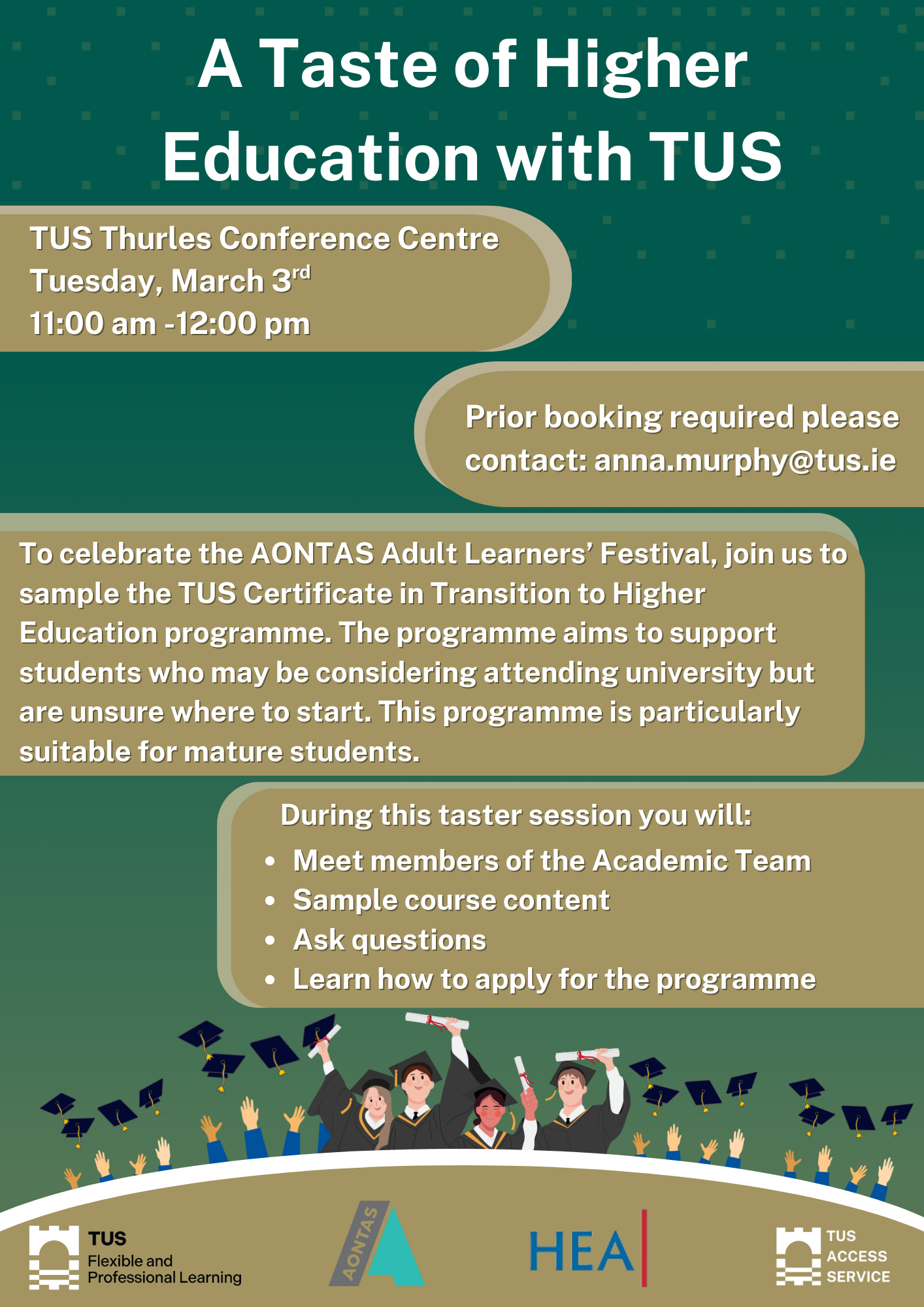To celebrate AONTAS Adult Learners’ Festival the first in-person taster sessions for the Certificate in Transition to Higher Education will be held at TUS Thurles Campus on Tuesday 3rd March from 11am-12pm in the Conference Centre