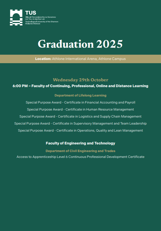 If you have any further enquiries, please contact aoife.kelly@tus.ie at the Department of Lifelong Learning Office or telephone: 090 6483055